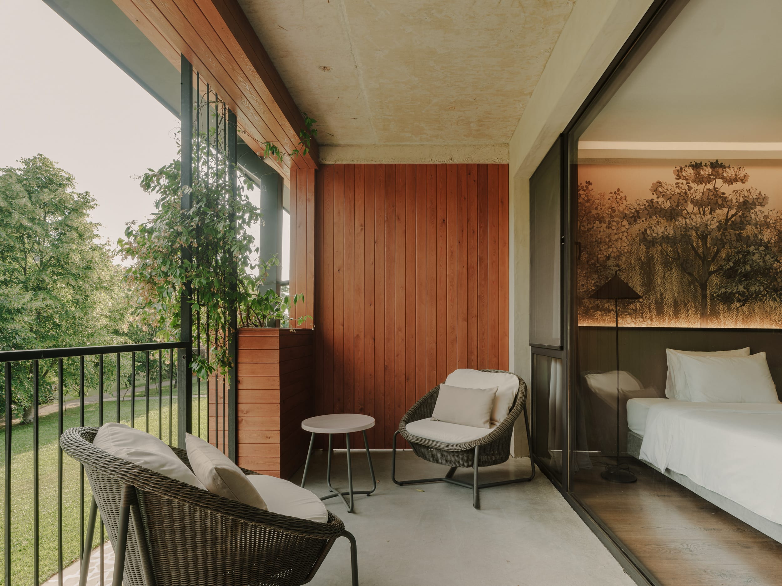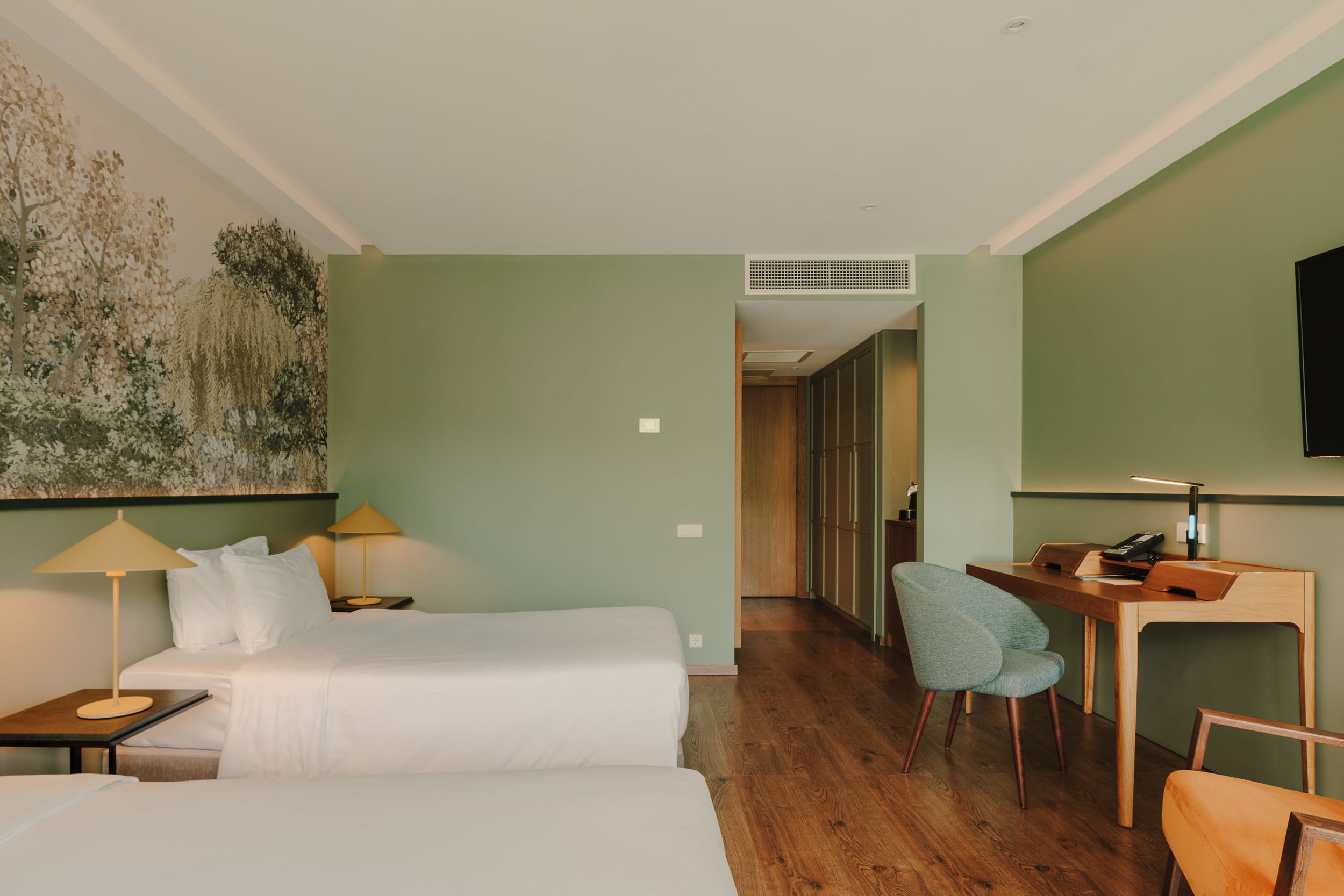 The Junior Suite offers generous space and a wide balcony, making it one of the resort’s standout rooms. A hand-painted botanical wall panel, inspired by Lopota’s nature, creates a calm and harmonious atmosphere throughout the space