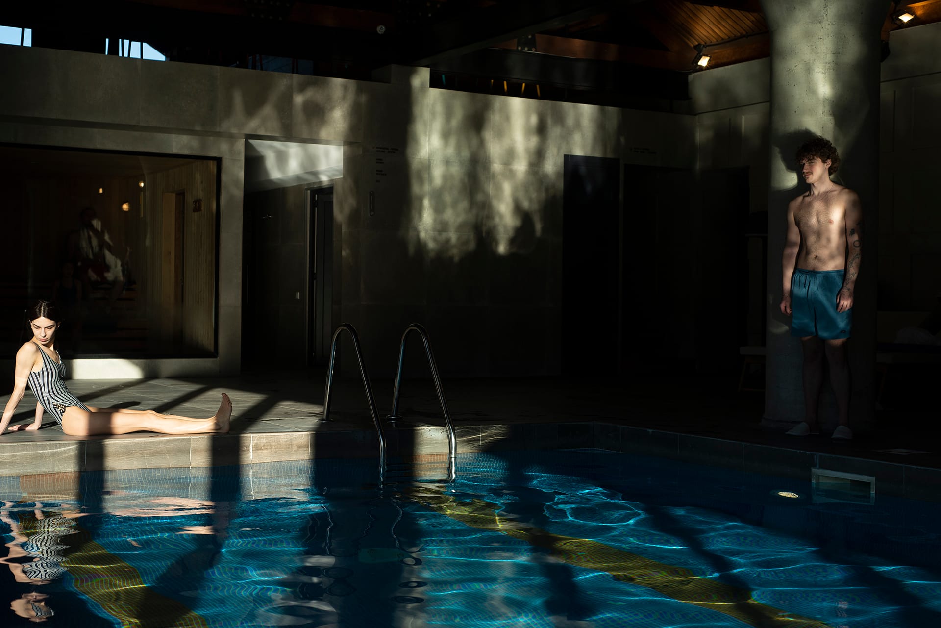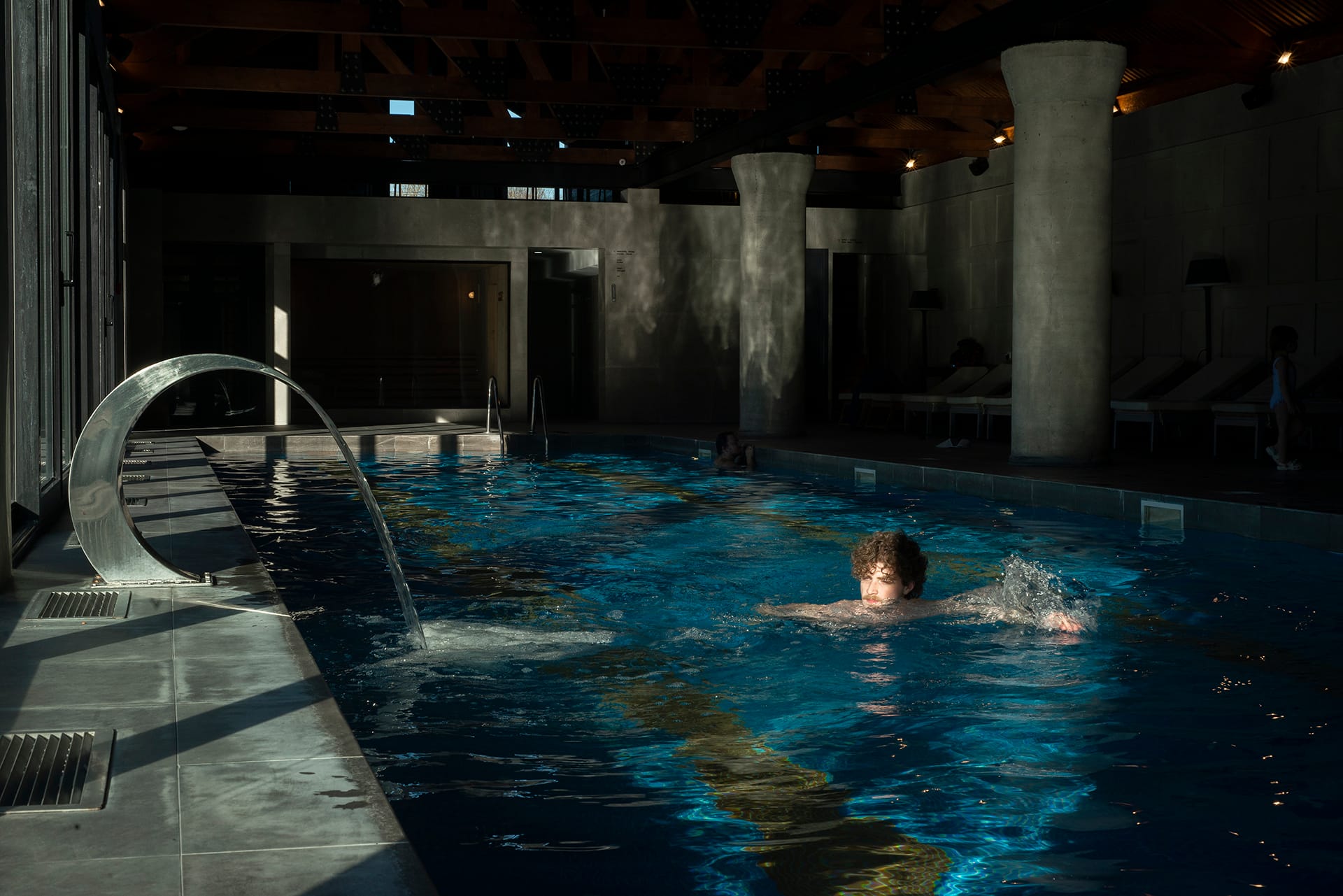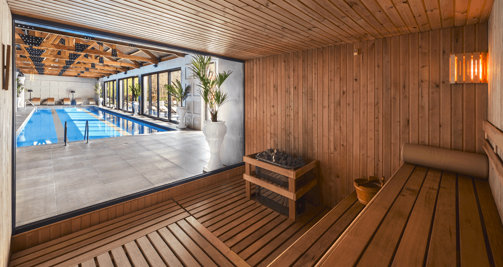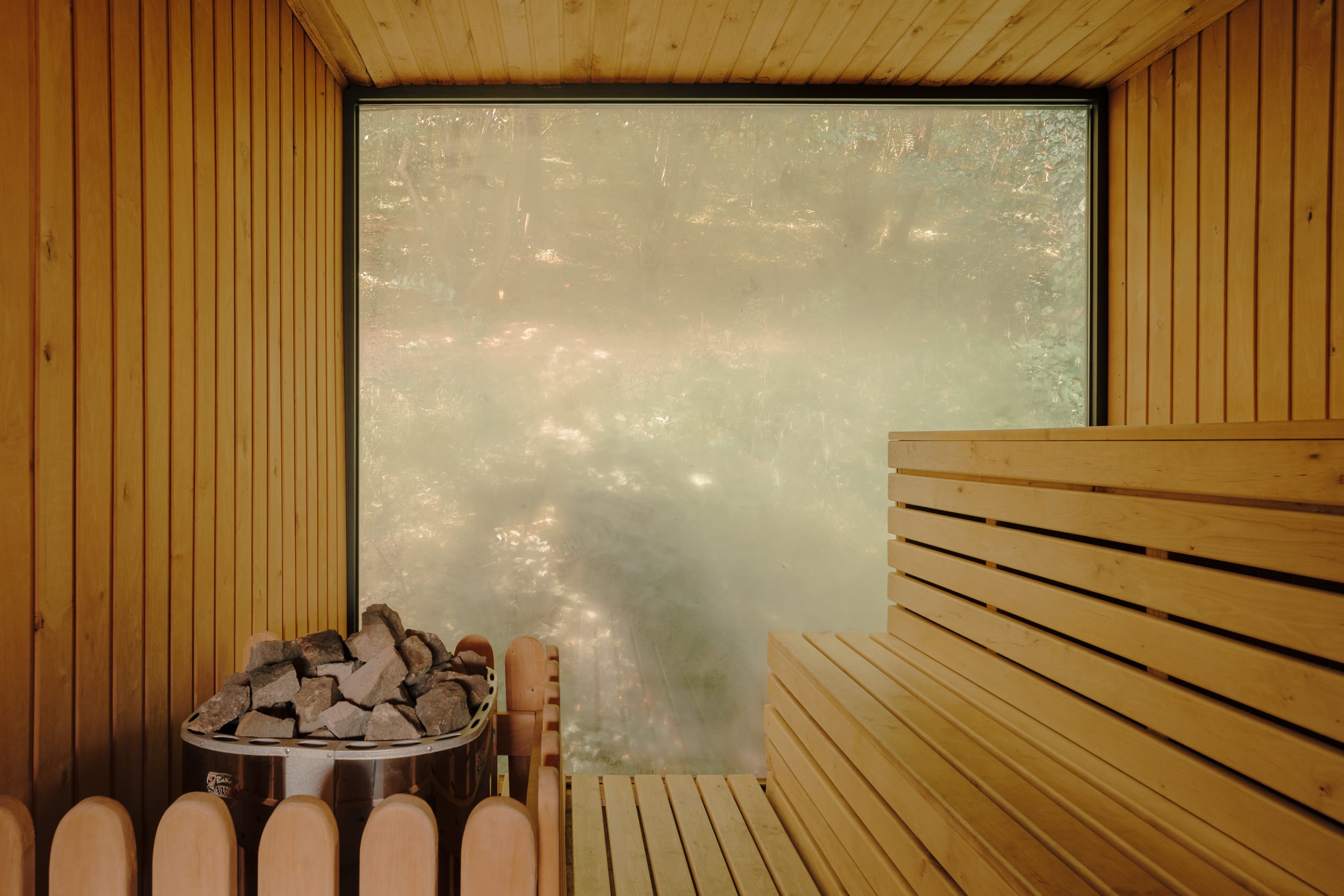 The energy of water and natural light streaming through large windows create a calm and restorative atmosphere. The space is defined by its quiet setting and includes a Finnish sauna