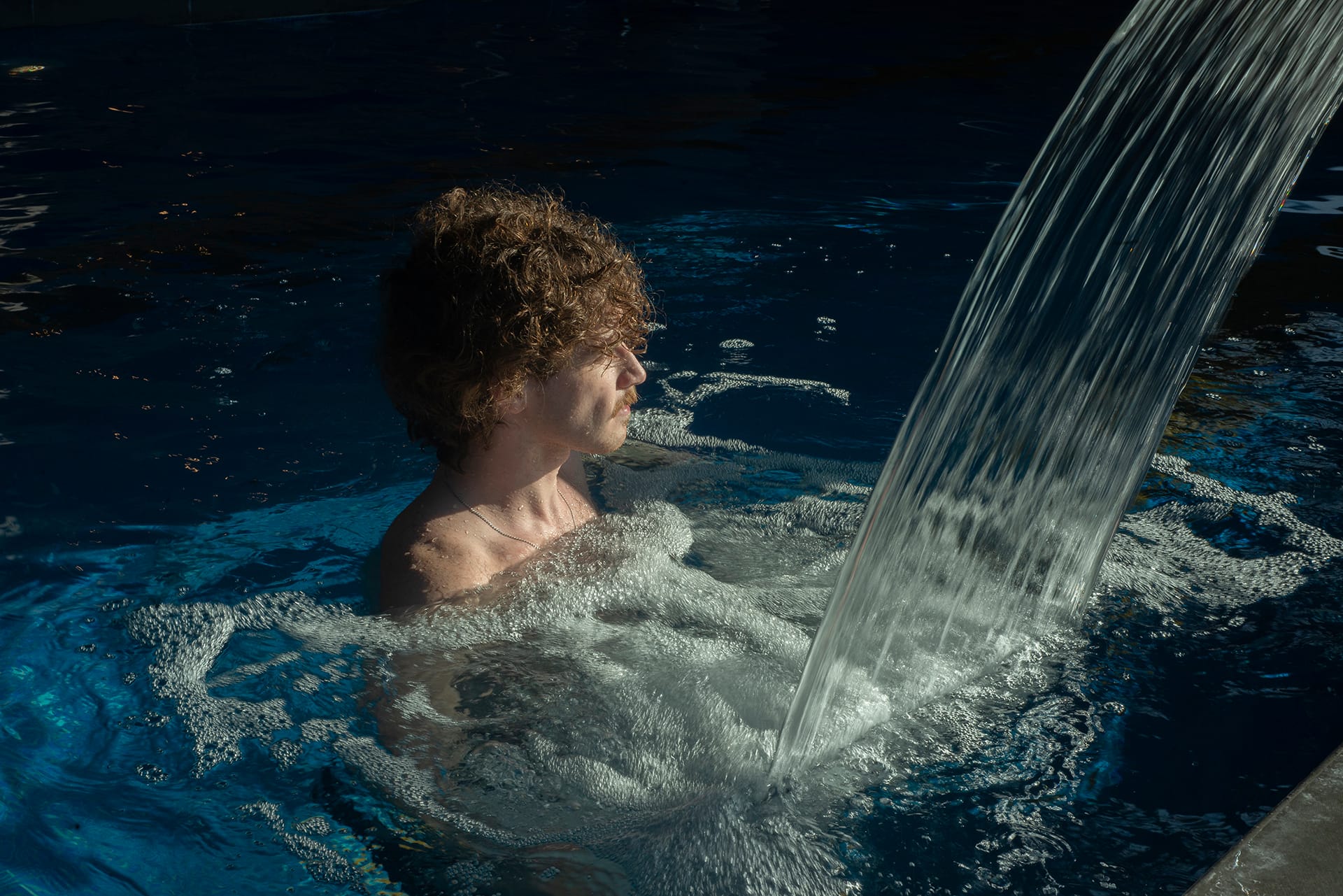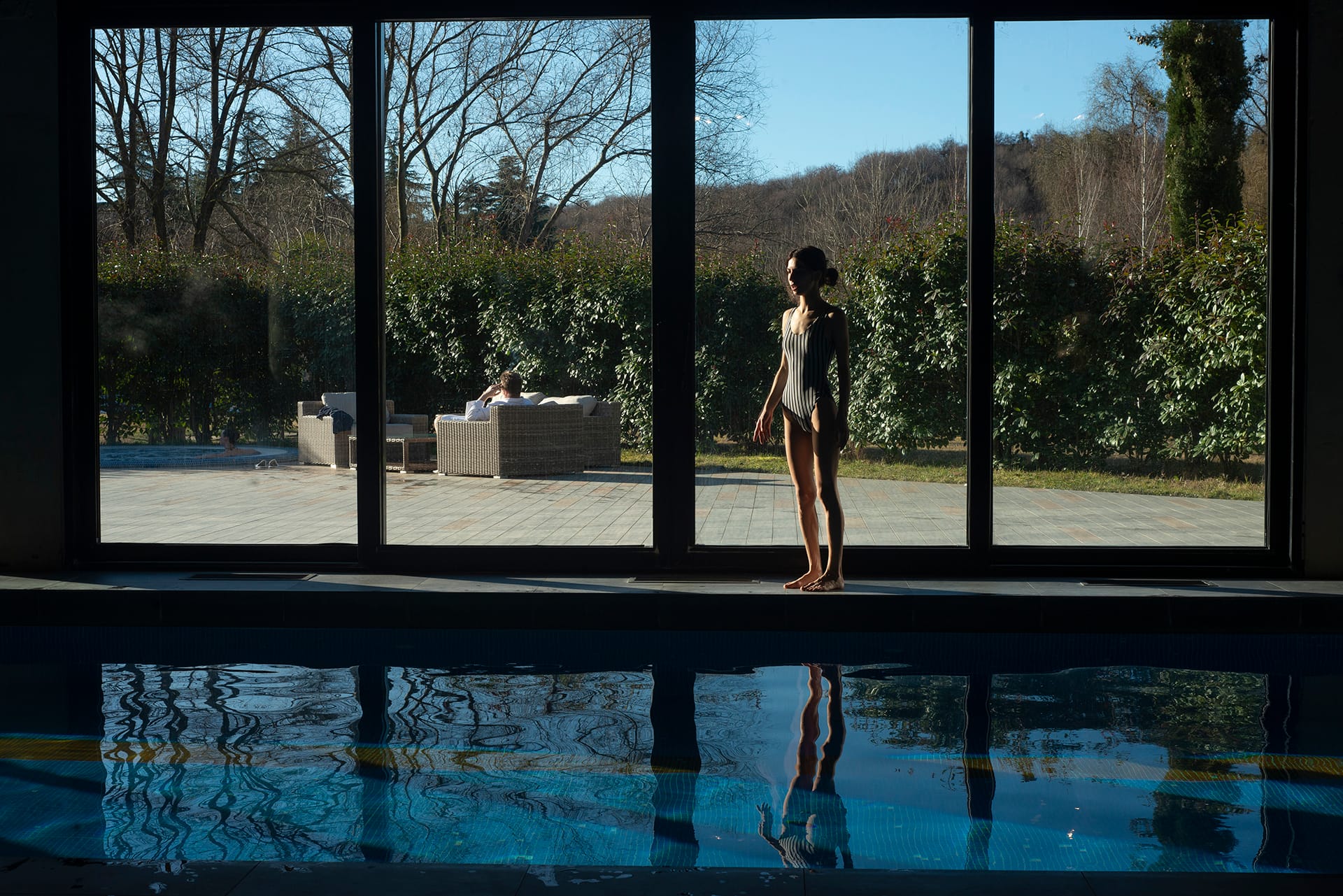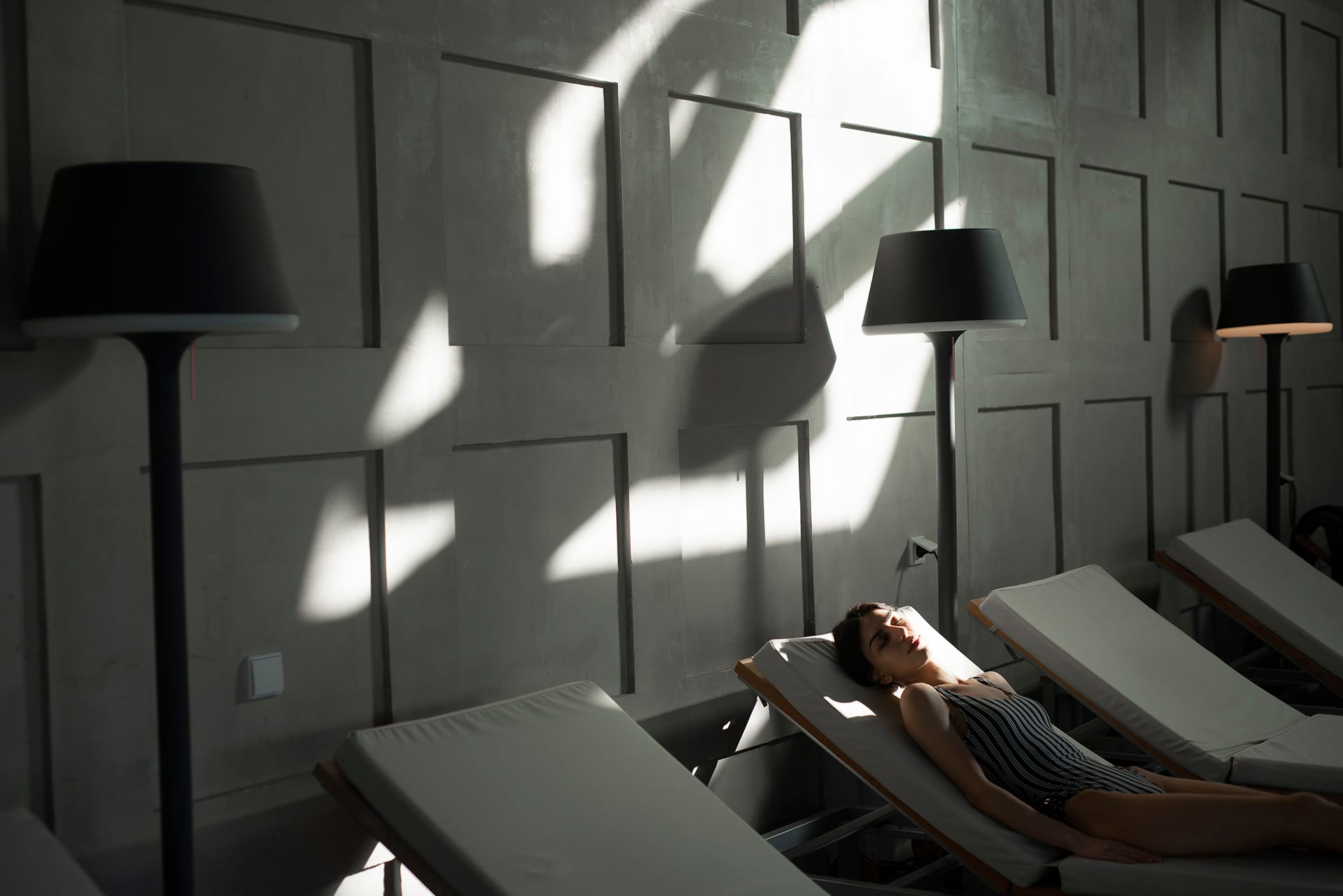 The energy of water and natural light streaming through large windows create a calm and restorative atmosphere. The space is defined by its quiet setting and includes a Finnish sauna