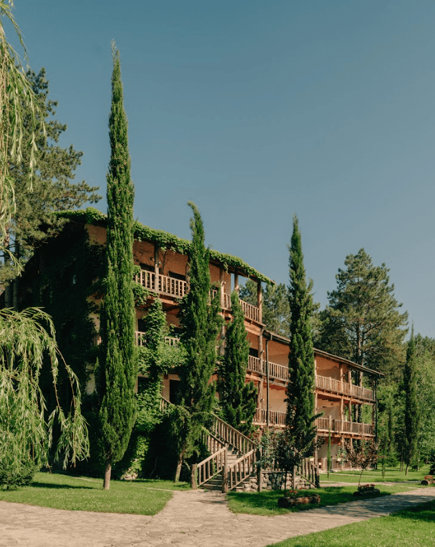 Today, Lopota brings together 16 buildings with wellness, adventure, dining, and conference spaces, all in harmony with nature—without ever feeling overwhelming. A rich landscape of plants, roaming animals and birds, organic vineyards, olive trees, and beehives deepen the connection to nature. At the heart of it all is Bobby, the loyal dog who has become a symbol of the resort.